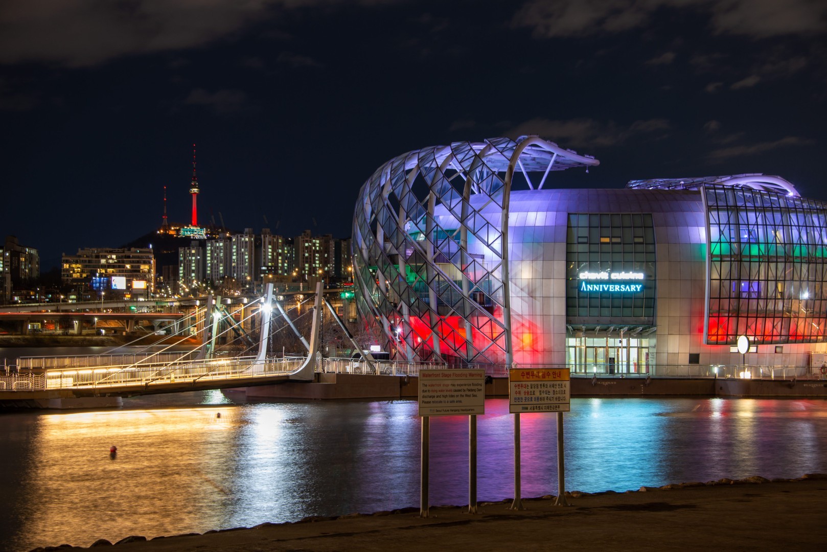 По традиция и за втора поредна година, в бяло, зелено и червено засия също футуристичният комплекс от плаващи острови Some Sevit в подножието на моста Banpo на река Hangang или – както е известен в Република Корея – комплексът Sebitseom (Островите на трите светлини).