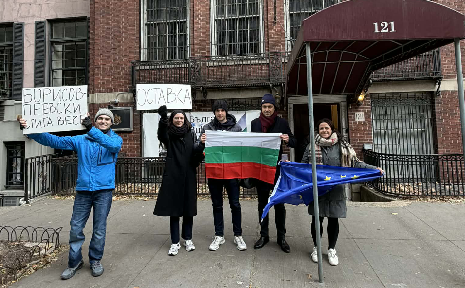 Българи, които живеят в Ню Йорк, се събраха пред Генералното ни консулство там, за да покажат своята съпричастност към протестите в България срещу управляващото мнозинство. С плакати "Оставка", "Борисов-Пеевски - стига вече!" те подкрепиха исканията от площадите в Родината където за втори път този месец хората искат оставка на кабинета на Росен Желязков и излизане от политиката на лидера на ГЕРБ Бойко Борисов и ДПС-НН Делян Пеевски.