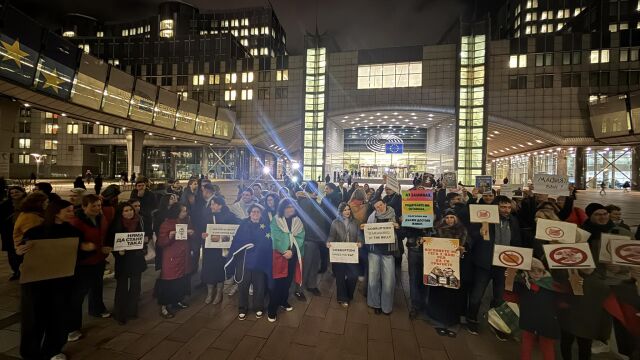 Пред сградата на Европейския парламент в Брюксел се чуват възгласи „Оставка!“ и се виждат плакати срещу корупцията в България. Сред присъствалите над 100 души има и деца, участват и евродепутатите Радан Кънев (ДСБ/ЕНП) и Никола Минчев (ПП–ДБ/„Обнови Европа“).