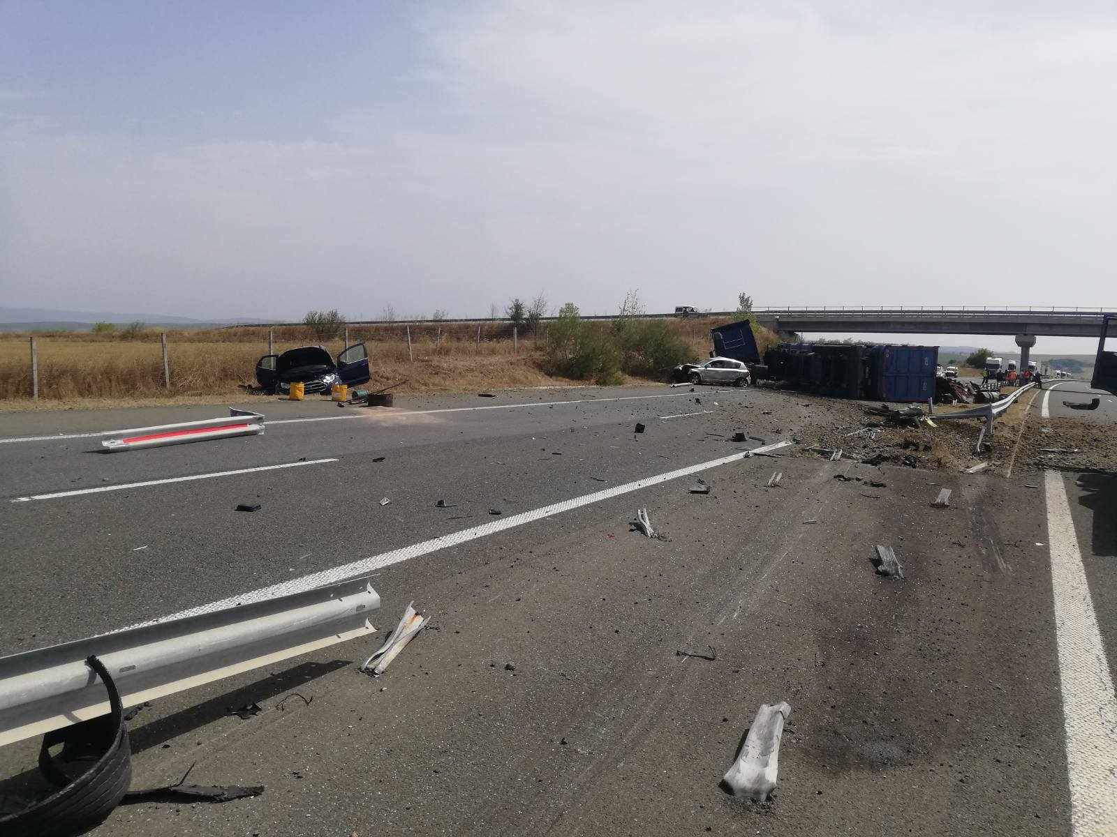 Камион на "Динко" се обърна, помете 3 коли и затвори магистрала "Тракия" и в двете посоки (СНИМКИ)