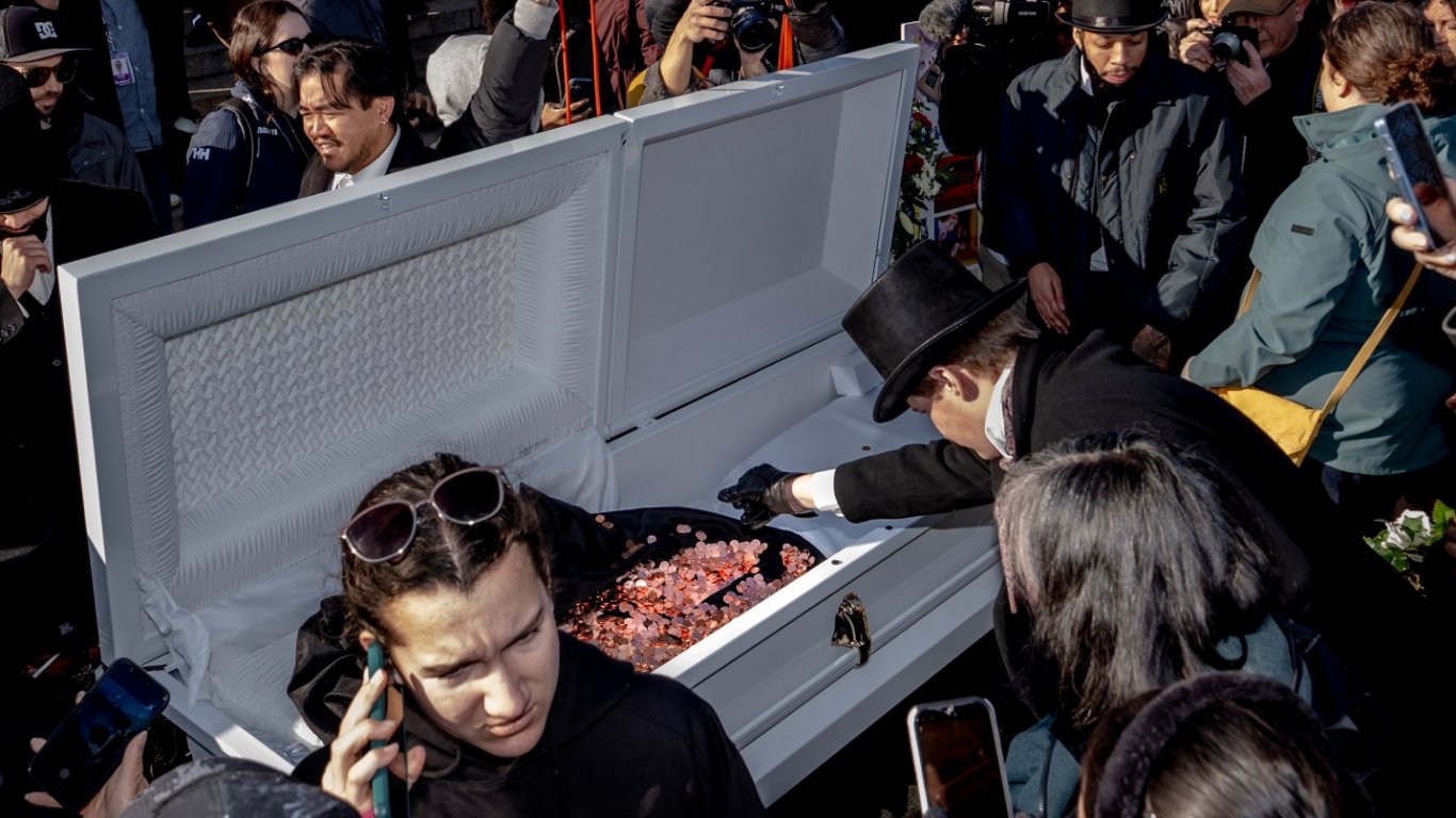 Присъстващите "погребаха" пенита в бял ковчег.