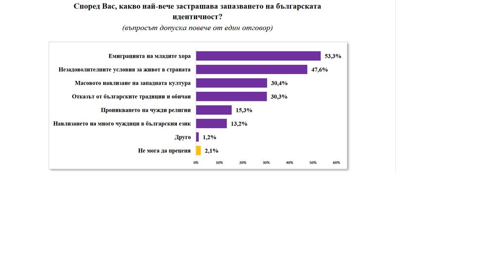 Според 53,3 % запазването на българската идентичност се застрашава най-вече от емиграцията на младите хора, според 47,6 % - от незадоволителните условия за живот в страната, според 30,4 % - от масовото навлизане на западната култура, според 30,3 % - от отказа от българските традиции и обичаи, според 15,3 % - от проникването на чужди религии, според 13,2 % - от навлизането на много чуждици в българския език.