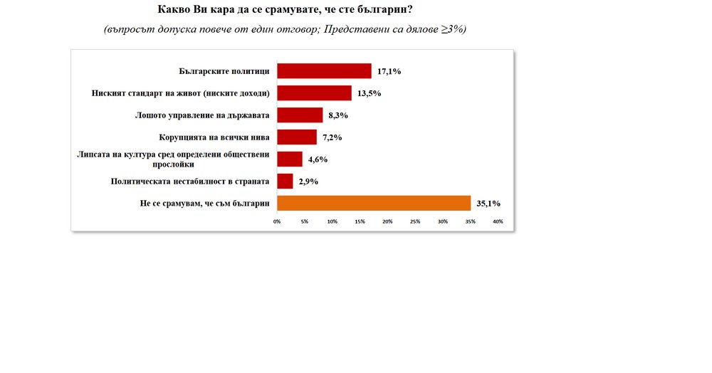 Сред основните поводи за срам са българските политици (17,1 %), ниският стандарт на живот, ширещата се бедност (13,5 %), лошото управление на държавата (8,3 %), корупцията на всички нива (7,2 %).